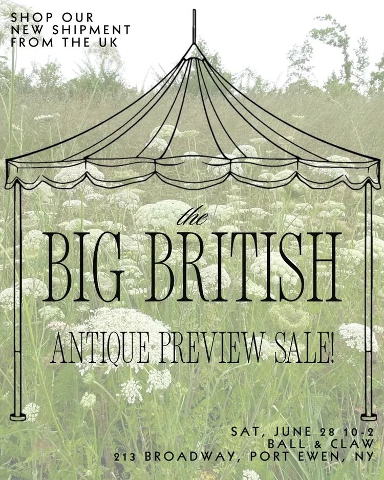 This Saturday, June 28, from 10-2, our newest dealer, Elizabeth, of Winslow Antiques, will be hosting 'The Big British Antique Preview Sale' under the big tent. She’s unpacking cupboards, tables, seating, lighting, mirrors and lots, lots more. Special preview pricing - everything is 15% off during sale hours (including her inventory in the Arsenic Room upstairs!) If you've been in the shop recently, you have probably fallen in love with her room — full of gorgeous English furniture, dishes, lighting, art, mirrors, and more. She is now bringing a container full of fresh old things to the big tent, and this will be an amazing opportunity to get first pick at her carefully curated treasures.